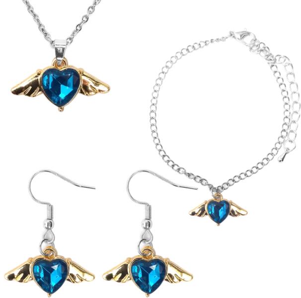 Kék kristály szív angyalszárnnyal nyaklánc, karkötő és fülbevaló szett. Paraméterek: Medál / mérete kb. 2,5 cm. Anyaga fémötvözet. Fémrészek anyaga rozsdamentes acél. Elegáns, nem hivalkodó, diszkrét. – Lánc hossza 50 cm. (Ha ettől eltérő méretben szeretnéd, írd be megjegyzésbe!) – Karkötő hossza kb. 17+5 cm. (Ha ettől eltérő méretben szeretnéd, írd be meg