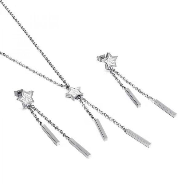 Long Star Szett Csodaszép Long Star ékszerszett verhetetlen áron. A szett nyakéket és fülbevalókat tartalmaz. A fülbevalók beszúrósak. Az ékszer nem tartalmaz nikkelt, ezért érzékeny bőrű emberek is viselhetik. Tulajdonságok: A nyakék hossza: 40cm + 5cm A medál mérete: 5,7cm x 1cm A fülbevalók mérete: 6cm x 1cm Anyaga: Nemesacél 316L Szín: Ezüst