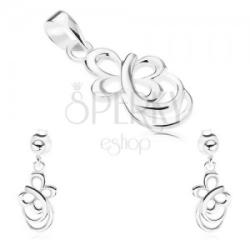 925 ezüst szett bedugós fülbevalóból és egy medálból. A fülbevaló és a medál is lapos pillangó körvonalú, amelyből két egymást keresztező ívelt vonal emelkedik ki. A pillangó felülete fényes és sima. A medál méretei: 10 x 18 mmA medál súlya: 0,66 gA láncra kerülő szem szélessége: 3 mmMedál lánc nélkül. A fülbevaló méretei: 8 x 13 mmA fülbevaló súlya: 1,56