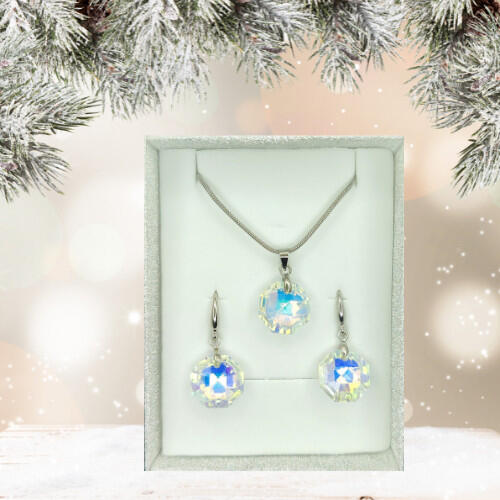 Csillogó fehér Swarovski kristályos medál és fülbevaló együttese. Tartós, minőségi anyagának köszönhetően, nem színeződik víz hatására sem. Antiallergén ékszer. Nyakláncon levő kristály átmérője: 14 mm. Nyaklánc hossza: 40 cm + 5 cm hosszabbító. Nyaklánc szélessége: 1,2 mm. Fülbevaló kristály átmérője: 14 mm. Fülbevaló teljes hossza: 34 mm. Csillogó ezüs