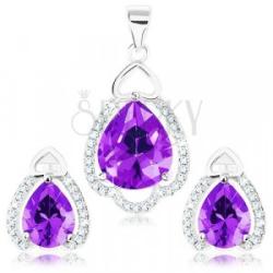 925 ezüst fülbevaló és medál szett, amelyek fényes, tanzit árnyalatú csiszolt könnycsepp alakú cirkóniákból állnak, melyeknek az oldalát átlátszó cirkóniákkal kirakott kehelyvirág kontúr szegélyezi. A felső részén fényes, apró fordított szívkontúr található. A fülbevaló orosz zárral kapcsolódik. A medál részét képezi a fényes láncszem is. A medál mérete