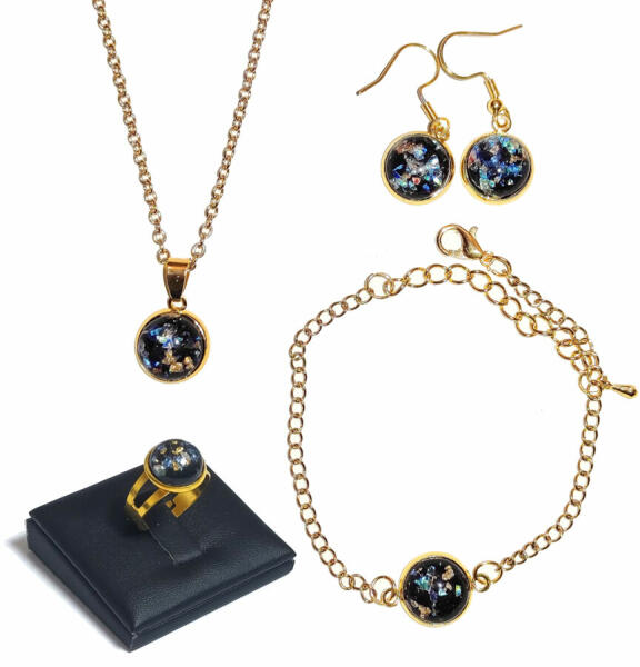 Színes csillámos (lánc, karkötő, fülbevaló, gyűrű) szett, arany és ezüst színben. A szett tartalma: medál lánccal, fülbevaló, karkötő, rendelhető arany és ezüst színekben. Válaszd ki a listából, hogy arany vagy ezüst színben, és milyen méretben kéred, vagy írd be rendeléskor a MEGJEGYZÉSBE. Az alapár 50 cm-es láncot és 17 cm-es karkötőt, állítható gyűrűt