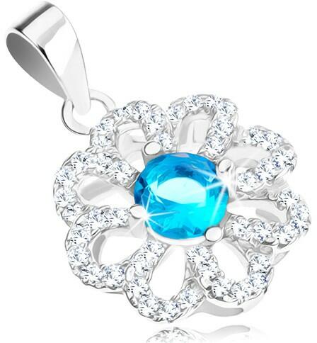 925 ezüst szett medálból és fülbevalóból ródiumozott felszínnel virág alakban, mely hosszúkás átlátszó cirkóniákkal kirakott sziromkörvonalakból áll. A virág közepét kerek akvamarinkék cirkónia alkotja. A medál része a fényes láncra kerülő szem. A fülbevaló kapcsolása orosz patent. Medál mérete: 14 x 14 mmLáncra kerülő szem szélessége: 3 mmMedál súlya: 1,