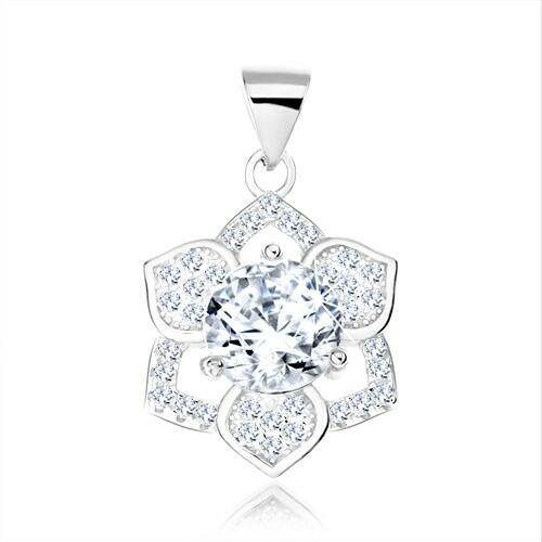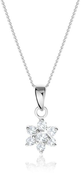 Ezüst szett medálból és bedugós fülbevalóból ródiumozott felülettel és virág alakban hat szirommal. A szirmok végei csúcsosak és váltakoznak az átlátszó cirkóniákkal kirakott ezüst keretű és kivágott átlátszó cirkóniás keretű szirmok. A szirmok az átlátszó követ fogják közre, amely kerek és foglalatban helyezkedik el. A medál méretei: 14 x 15 mmA medál súl