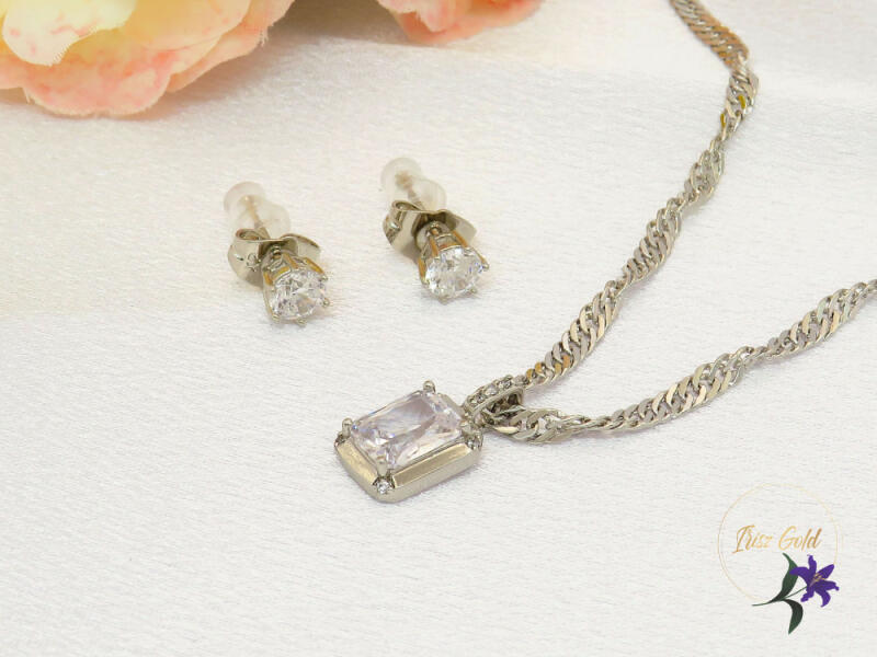 Antiallergén szett nyaklánc fehér kocka köves medál , szegfű fülbevaló Szin: rodium Méret: 46cm/2 mm Medál: 18x8mm Fülbevaló: 5 mm Bedugós A forgalmazott divatékszerek alapanyaga nikkel és ólommentes ezért többnyire nem okoznak allergiás tüneteket, nyugodtan hordhatják fémérzékeny emberek is. Általában nem színezik a bőrt és más divatékszerekhez képest nagyságrende