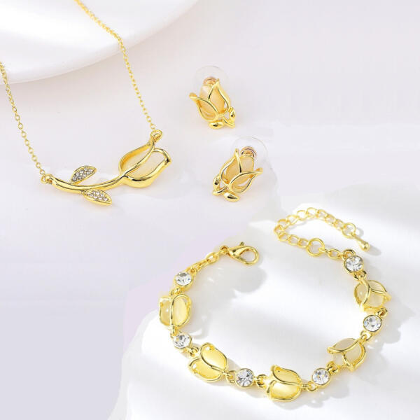 Cikkszám: 0065 Exkluzív 3 részes ékszerszett: - arany bevonattal, - krémszínű macskaszem opállal, - áttetsző kristályokkal, - állítható hosszúságú lánccal ( 40 cm - 45 cm ), - 1 pár beszúrós fülbevalóval ( 1,7 cm x 1 cm ), - állítható karkötővel ( 16 cm + 4 cm ). A medál mérete: 3,5 cm x 1,5 cm. Súly: 25 g. Rendkívül gyönyörű, elegáns, opálos-kristályos éksz