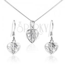 Szett 925 ezüstből, amely lógó fülbevalóból és nyakláncból áll. A nyakláncot apró, ovális szemekből álló lánc és egy medál alkotja. Delfinkapoccsal záródik. A fülbevaló és a medál lapos, egyenletes szívből áll, kivágott felülettel, amelyek négyágú szívet képzenek. A fülbevaló méretei: 12 x 9 mmA fülbevaló súlya: 2,08 gA medál méretei: 12 x 10 mmA medál