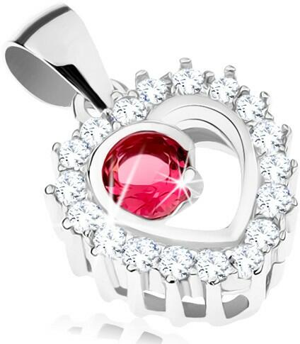 925 ezüst szett ródiumozott felszínnel medálból és fülbevalóból szívkörvonal alakban, mely átlátszó csillogó cirkóniákkal van kirakva. A szív egyik ívében kerek csiszolt cirkónia található sötétrózsaszínben. A pálcák, melyek a cirkóniát tartják hosszítottak és a szív körül recés szegélyt alkotnak. A medál láncra kerülő szeme fényes. A fülbevaló kapcsol
