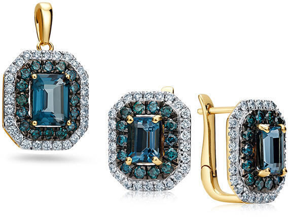 A londoni kék Sandra topázzal díszített arany egy lenyűgöző ékszer, amely egy csipetnyi luxust és eleganciát kölcsönöz. Ez a szett 14 karátos sárga aranyból készült. Az ékszert 124 tiszta és kék gyémánt díszíti, amelyek összsúlya 2,180 ct. A szett központi darabja egy csodálatos, 4,410 ct súlyú londoni kék topáz, amely mélykék színével és elegánsan csillogó