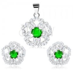 Ródiumozott 925 ezüst szett medálból és fülbevalóból. Virág alkotja átlátszó cirkóniás szirmokkal és smaragdzöld kerek cirkóniás középpel. A láncra kerülő szem hosszúkás alakú és fényes sima a felszíne. A fülbevaló kapcsolása orosz patent. Medál mérete: 14 x 14 mmLáncra kerülő szem szélessége: 3 mmMedál súlya: 2,3 gMedál lánc nélkül. Fülbevaló mérete