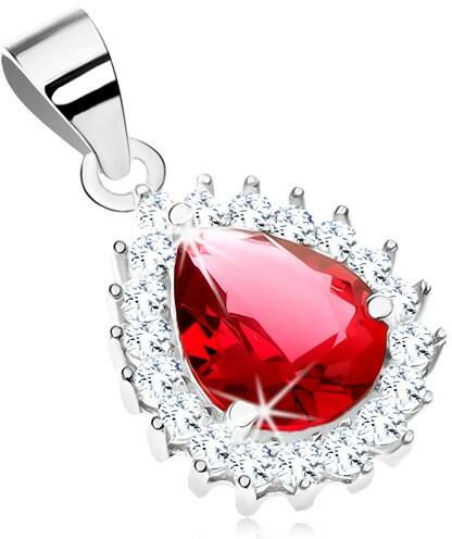 Ródiummal ellátott szett fülbevalóból és medálból 925 ezüstből rubinvörös csiszolt csepp alakban átlátszó cirkóniás szegéllyel. A cirkóniák fényes pálcával vannak megfogva, mely a csepp körül recés szegélyt alkot. A medál része a láncra kerülő szem is. A fülbevaló kapcsolása orosz patent és a felszíne ródiummal van ellátva. Medál mérete: 12 x 14 mmLáncra k