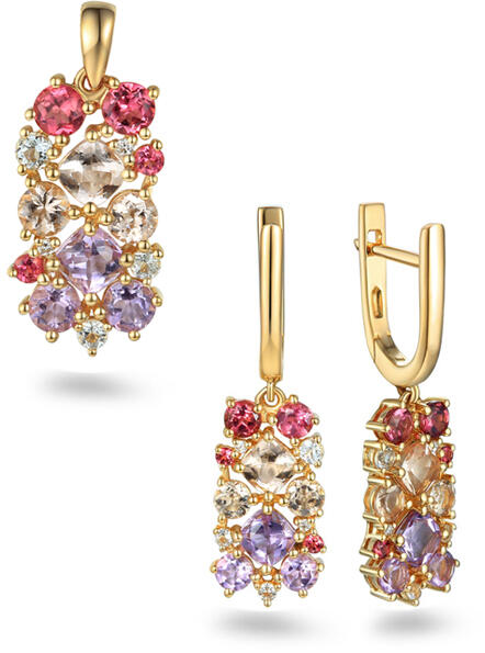 Ez az elbűvölő, ékszerekkel díszített szett olyan nők számára készült, akik nem félnek kifejezni stílusukat és luxusérzéküket. A fő elemek természetes drágakövek, mint az ametiszt, a morganit, a topáz és a turmalin, amelyek együttesen a színek gyönyörű szimfóniáját alkotják, és minden egyes kő sajátos energiát és stílust kölcsönöz az ékszereknek. A 4,37 ka