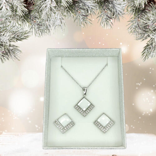 Ezüstszínű nemesacél (316L) fülbevaló és nyaklác medállal szett, melyet fehér kerámia díszít és fehér cirkónia kristályok tesznek csillogóvá. A nemesacél és a kerámia előnyös tulajdonságainak köszönhetően nem törékeny, nem kopik. Tartós, minőségi antiallergén ékszer. Nyaklánc hossza: 42 cm+ 4,5 cm (hosszabbítható). Nyaklánc szélessége: 1,5 mm. Medál méret