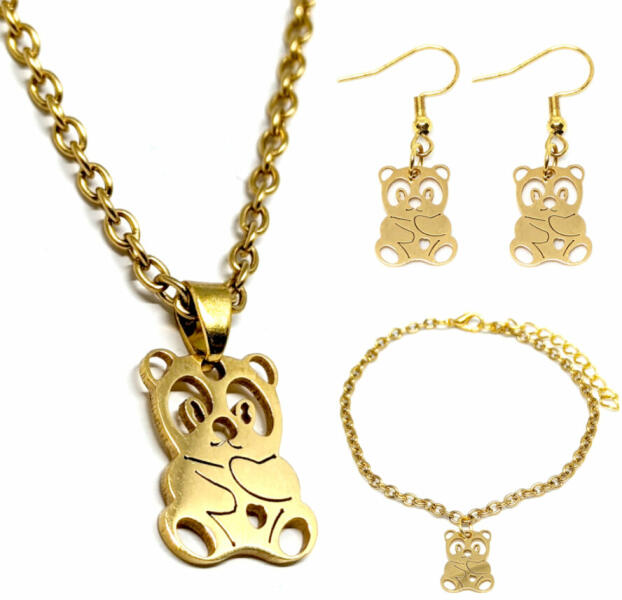Pandás nyaklánc, karkötő és fülbevaló szett. Különleges, szépen kidolgozott ékszer, ajándéknak is kiváló, dobozban szállítjuk. Paramé terek: Me dál mérete 1,6 x 1,2 cm, színe arany, anyaga nemesacél. Lánc hossza 50 cm, ha eltérő méretet szeretnél, írd be megjegyzésbe. Karkötő mérete 17+5 cm. (Ha ettől eltérő méretet szeretnél, rendeléskor a MEGJEGYZÉSBE írd
