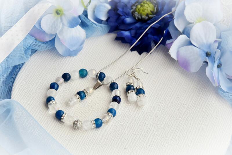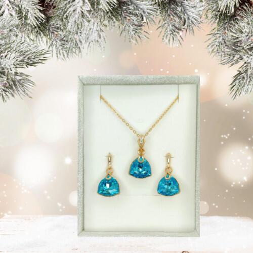 Csillogó égszínkék Swarovski kristályos medál és fülbevaló együttese. A medált apró fehér kristályok díszítik. Tartós, minőségi anyagának köszönhetően, nem színeződik víz hatására sem. Antiallergén ékszer. 18K arany színben kapható. Kristályok mérete: 13 mm x 12 mm. Nyaklánc hossza: 40 cm + 5 cm hosszabbító. Nyaklánc szélessége: 1,5 mm. Fülbevaló teljes ho