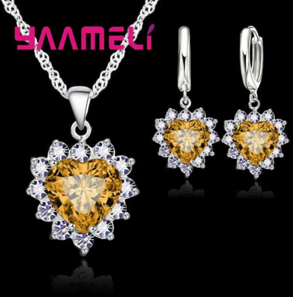 Pezsgő és áttetsző kristály szív nyaklánc és fülbevaló szett. Minden alkalomra tökéletes, finom és elegáns, mégis látványos szett. Nyaklánc hossza: 45 cm, medál és fülbevalók: 1,5x1,5 cm. Fémötvözet és kristály. Egy jól megválasztott ékszer öltöztet, feldobja a napodat, valahányszor ránézel, jobb kedvre derülsz. A színekkel és anyagokkal manapság könnyű var