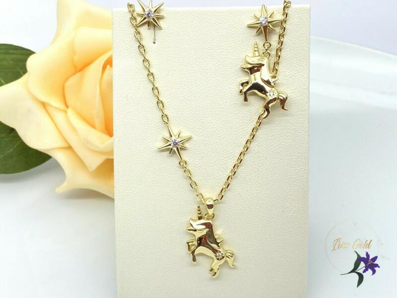 Gyönyörű unikornisos szett Szin: 14Kr Nyaklánc :39-45 cm Asszimetrikus fülbevaló: 20 x10 mm/14x10mm Nyakláncon szintén egy csillag és egy unikornis. A forgalmazott divatékszerek alapanyaga nikkel és ólommentes ezért többnyire nem okoznak allergiás tüneteket, nyugodtan hordhatják fémérzékeny emberek is. Általában nem színezik a bőrt és más divatékszerekhez képest nagysá