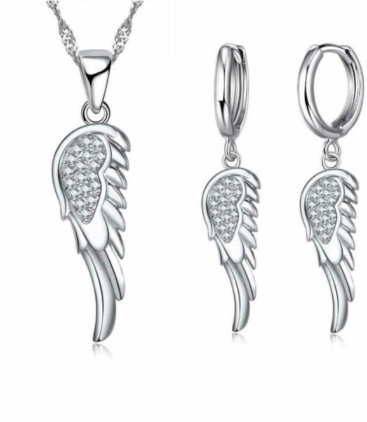 Ezüstözött Angyalszárny motívumos nyaklánc és fülbevaló szett. Nyaklánc 45 cm. Medál és fülbevalók: 2 cm, fémötvözet és kristály. Egy jól megválasztott ékszer öltöztet, feldobja a napodat, valahányszor ránézel, jobb kedvre derülsz. A színekkel és anyagokkal manapság könnyű variálni a különböző stílusokat, nem kell ragaszkodni a hagyományos szettekhez, nem fe