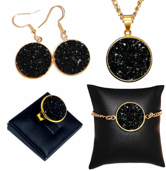 Fekete csillámos (lá nc, karkötő, fülbevaló, gyűrű) szett, arany és ezüst színben. A szett tartalma: medál lánccal, fülbevaló, karkötő, gyűrű. Rendelhető arany és ezüst színekben. Válaszd ki a listából, hogy arany vagy ezüst színben, és milyen méretben kéred, vagy írd be rendeléskor a MEGJEGYZÉSBE. Az alapár 50 cm-es láncot és 17 cm-es karkötőt, állítható