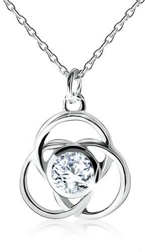 925 ezüst szett nyakékből és fülbevalóból. A nyakék ovális szemekből álló láncból áll és medálból virág körvonal alakban három kerek szirommal, amelyek fedik egymást. A virág középen egy kerek átlátszó cirkóniával van díszítve fényes foglalatban. A fülbevaló alakja ugyanolyan és bedugós. A fülbevaló méretei: 10 x 10 mmA fülbevaló súlya: 1,5 gA medál mér