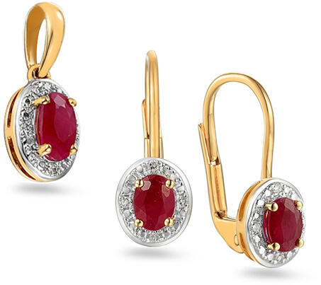 Az ékszer finom vonalait ovális alakú dísz díszíti, amelynek közepére rubint helyeznek. A fülbevalók belső magassága 12 mm. A medálszem belső magassága 3,5 mm. A gyémántok iZlato® eredetiségigazolással rendelkeznek.