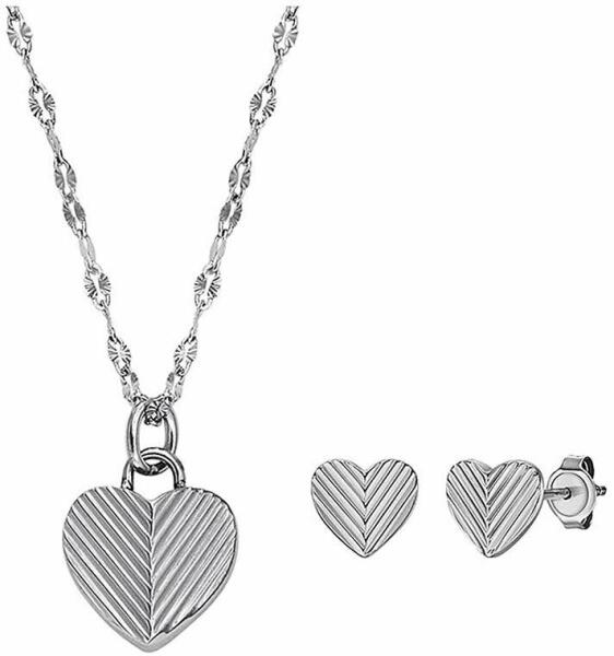 A fülbevaló, nyaklánc és karkötő szett 925 ezüstből készült, egyforma motívummal. A nyaklánc merőlegesen összekapcsolt ovális szemekből áll, melyen egy szív alakú tükörfényes medál függ. A szív szimmetrikus, benne egyhén gravírozott Sarkcsillag található. A csillagban fekete színű csiszolt gyémánt van foglalva. A felülete rózsaszín árnyalatú. A nyaklánc és k