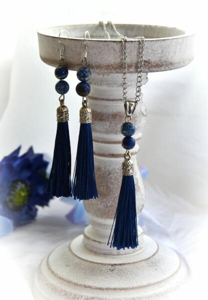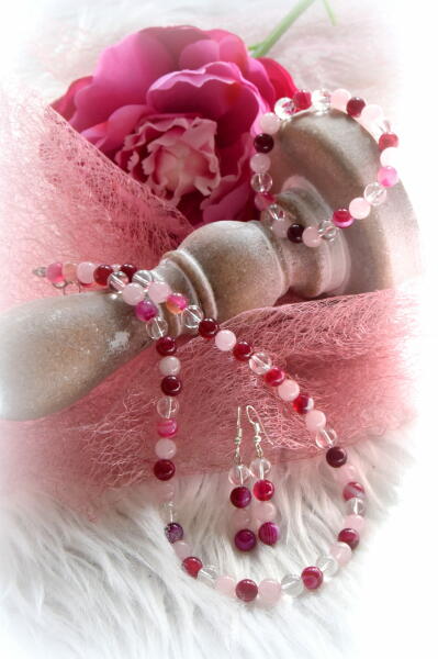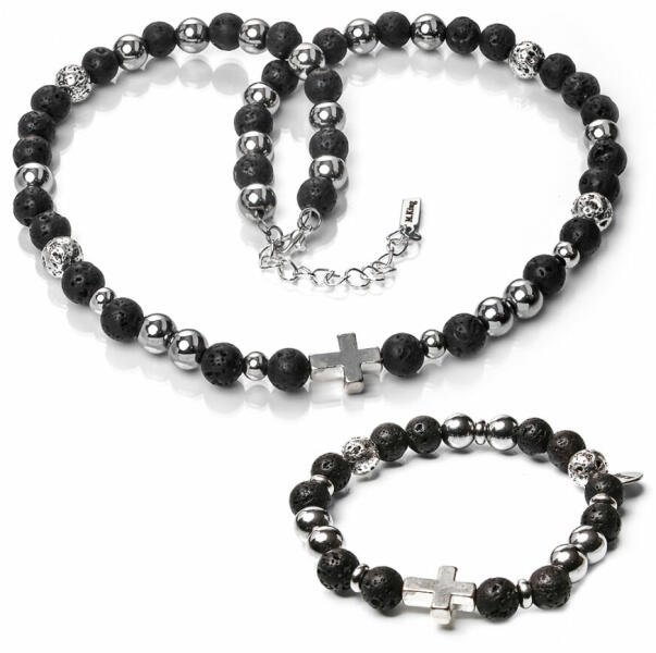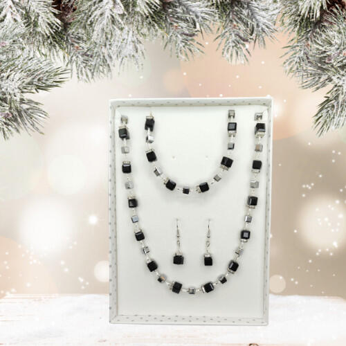 Szemet gyönyörködtető fekete és ezüstszürke üveg kristályos nyaklánc, karkötő és fülbevaló együttese, melyet fehér cirkónia kristályok tesznek csillogóvá. A kristályok és ásványok nemesacél sodrony alapon helyezekdnek el, fehér üveg kristály köztes szemekkel rögzítve. Tartós, minőségi anyagának köszönhetően nem kopik, nem színeződik, mindennapi viseletre is