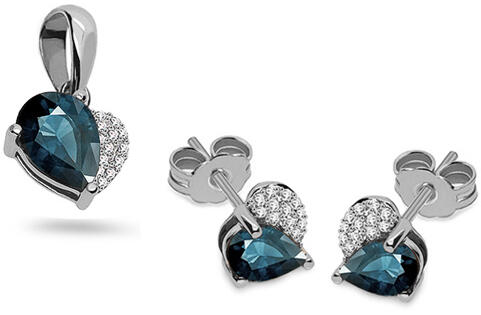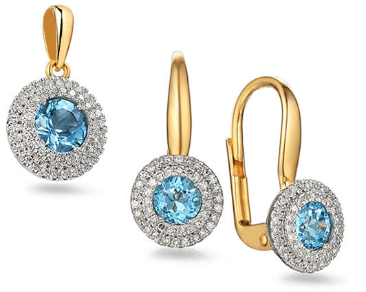 A gyönyörű topáz készlet kombinált aranyból készült. A fülbevalót kilencven, 0,180 ct össztömegű csillogó gyémánt díszíti, H szín és SI1 tisztaság. Ezeket egy gyönyörű égszínkék topáz veszi körül, súlya 0,650 ct. A fülbevaló szélessége 7,5 mm, a fülbevaló hossza 17 mm. Medál kombinált tizennégy karátos aranyból, ötven csillogó gyémánttal díszítve,
