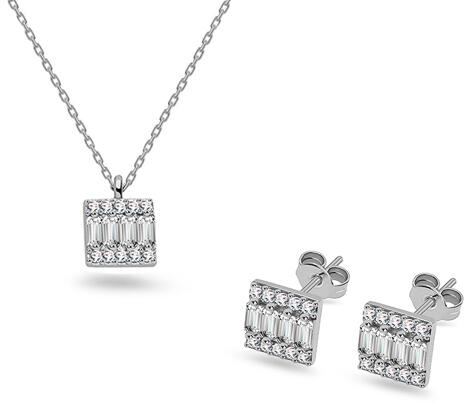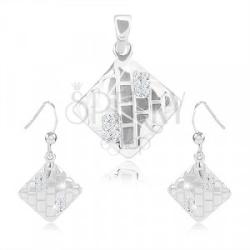 A 925 ezüst szettet medál és fülbevaló alkotja, amelyek rombusz alakúak fényes és enyhén domború felülettel. A rombusz formát függőleges és vízszintes vágatok téglalap alakú részekre választják. Mindegyik rombusz formán két rész apró átlátszó cirkóniákkal van kirakva. A fülbevaló afrikai horgokon függ, golyóval. A medál láncra kerülő szeme hosszúkás. Fülbe