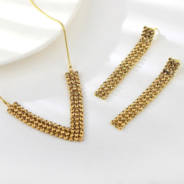 Cikkszám: 0894 Három részes ékszerszett (nyaklánc + fülbevaló + karlánc): - arany bevonattal, - áttetsző kristályos díszítéssel, - akasztós fülbevalóval. Medál mérete: 3,7 cm x 1,4 cm. Nyaklánc hossza: 40 - 45 cm (állítható) Karlánc hossza: 18 - 22,5 cm (állítható) Fülbevaló hossza: 4,4 cm. Alapanyaga: minőségi fémötvözet. Gyönyörű, elegáns ékszerszett!