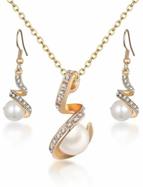 Romantikus gyöngyös medál nyaklánccal, fülbevalóval. Lánc hossza: kb. 45 cm, fülbevaló mérete: kb. 3,5x2,5 cm. A kövek nem teljesen szabályosan foglaltak, de összhatásában nagyon szép ékszerszett, amely egy nyakláncból és fülbevalóból áll. A gyöngyházfehér gyöngyök rendkívül elegánsak, esküvőre vagy fontosabb eseményre ideális választás. Fém ötvözet alapja