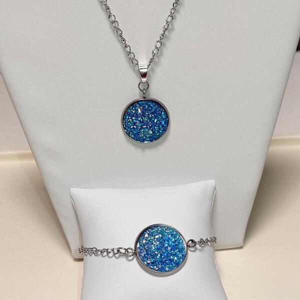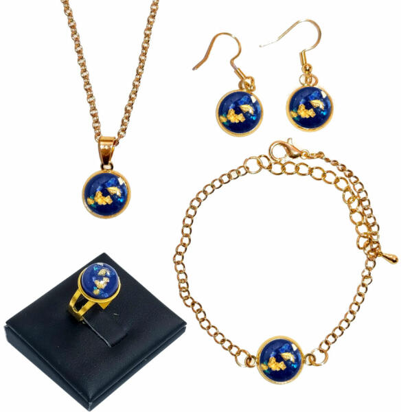 Színes csillámos (lánc, karkötő, fülbevaló, gyűrű) szett, arany és ezüst színben. A szett tartalma: medál lánccal, fülbevaló, karkötő, rendelhető arany és ezüst színekben. Válaszd ki a listából, hogy arany vagy ezüst színben, és milyen méretben kéred, vagy írd be rendeléskor a MEGJEGYZÉSBE. Az alapár 50 cm-es láncot és 17 cm-es karkötőt, állítható gyűrűt