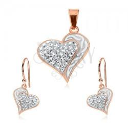 A 925 ezüst szett réz színű, amely fényes, szabálytalan szív alakú medálból és fülbevalóból áll. Egy ezüst színű sáv díszíti, amely az egyik felét szegélyezi és amelyben egy spirál van kivésve. A szív másik részét fehér anyag borítja, amelyben kerek, átlátszó cirkóniák vannak beültetve. A fülbevaló afrikai horgokon függ. A láncra kerülő szem hosszúkás