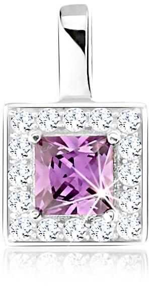 925 ezüst szett fülbevalóból és medálból pattintós kapoccsal és medállal rögzített láncszemmel. A dísz részben egy négyzetes lila cirkónia tűnik ki átlátszó kövekkel és egy ezüst vonallal keretezve. Az oldalak kerületén szűk kivágások helyezkednek el. Ródiumozott. A medál méretei: 8 x 8 mm A medál súlya: 1,57 g A láncra kerülő szem szélessége: 2 mm Medál lá