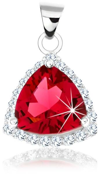 Ródiumozott szett 925 ezüstből bedugós fülbevalóból és medálból háromszög alakban lekerekített oldalakkal. Egy piros, csiszolt kő díszíti átlátszó ciróniás vonallal keretezve. A kerületén egyenletes háromszögű kivágások vannak. A medál méretei: 11,5 x 13 mmA medál súlya: 3,4 gA láncra kerülő szem szélessége: 4 mmMedál lánc nélkül. A fülbevaló méretei: 10