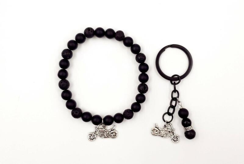 Az ékszerszett egy férfi ásványkarkötőből és egy kulcstartóból áll, egy-egy motor medállal. Az ékszerszett lávakő és matt fekete ónix ásványokból készült.