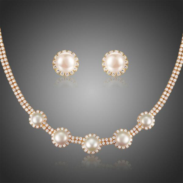Cikkszám: 0888 2 részes ékszerszett: - arany bevonattal, - cirkónia kristályokkal, - szimulált gyöngyökkel, - állítható lánccal (41 cm - 46 cm ), - beszúrós fülbevalóval. A fülbevaló mérete: 1,3 cm x 1,3 cm. Alapanyaga: minőségi, nikkelmentes fémötvözet. Elegáns, exkluzív, CZ kristályos ékszerszett ! A megadott méreteket kérjük vegyék figyelembe !
