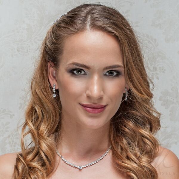 Finom kidolgozású, elegáns stílusú menyasszony nyaklánc és fülbevaló szett cirkónia kristályokkal díszítve, valódi fehérarany bevonattal. Nikkelmentes, bőrbarát fémötvözetből készült, nem okoz allergiát. Ragyogj ebben a szettben a nagy napon!Kifinomult stílusú menyaszony fülbevaló és nyaklánc szett, mely tökéletesen illik hófehér menyasszony ruhához, és az eskü