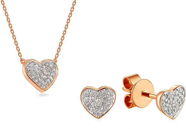 Rózsaaranyba csomagolt gyémántok kombinációja, gyönyörű minimalista szív alakú. A rózsaarany tónusai összesen hatvannégy gyémánt szikráját világítják meg, összsúlya 0,130 ct, H színe és átlátszósága SI1. A fülbevalók szélessége 5,5 mm, magasságuk 5 mm, csokornyakkendővel vannak rögzítve. A nyakláncon használt rögzítés nyelvgyűrűhöz készült, hossza 400