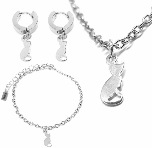 Cicás medálos nyaklánc, karkötő és fülbevaló szett, ezüst színű. Ajándéknak is kiváló, dobozban szállítjuk. Medál anyaga nemesacél, nyaklánc, karkötő és fülbevaló akasztó anyaga rozsdamentes acél. Medál mérete kb. 1,3 cm. Nyaklánc hossza 50 cm, ha eltérő méretet szeretnél, írd be megjegyzésbe . Karkötő mérete 17+5 cm. (Ha ettől eltérő méretet szeretnél,