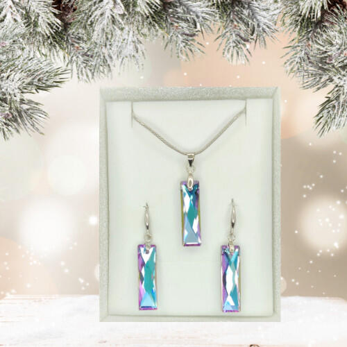 Csillogó lilás-kék Swarovski kristályos medál és fülbevaló együttese. Tartós, minőségi anyagának köszönhetően, nem színeződik víz hatására sem. Antiallergén ékszer. Nyakláncon levő kristály mérete: 26 mm x 7 mm. Nyaklánc hossza: 40 cm + 5 cm hosszabbító. Nyaklánc szélessége: 1,5 mm. Fülbevaló kristály mérete: 26 mm x 7mm. Fülbevaló teljes hossza: 42 mm. Csill