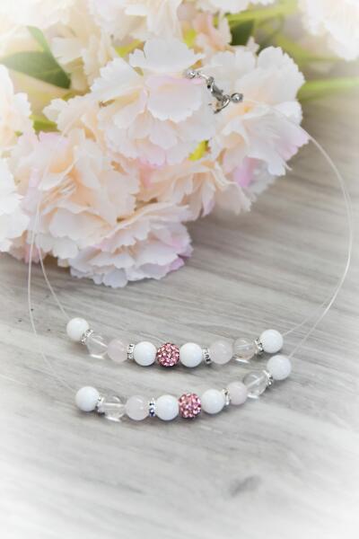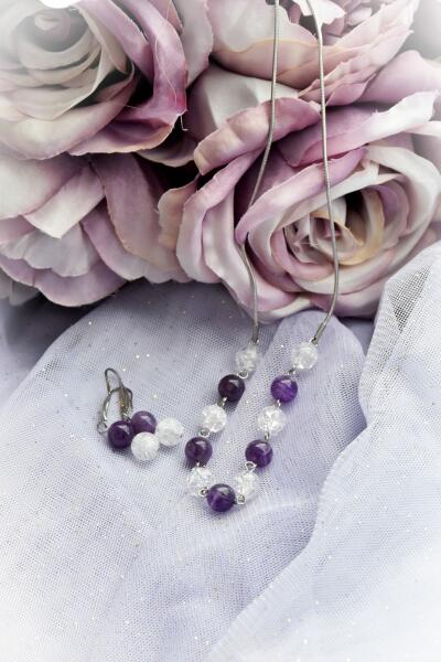 Szemet gyönyörködtető, színpompás aranybarna üveg kristályos nyaklánc, karkötő és fülbevaló együttese, melyet fehér cirkónia kristályok tesznek csillogóvá. A kristályok és ásványok nemesacél sodrony alapon helyezekdnek el, fehér üveg kristály köztes szemekkel rögzítve. Tartós, minőségi anyagának köszönhetően nem kopik, nem színeződik, mindennapi viseletre is