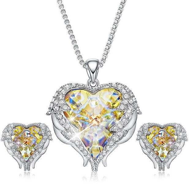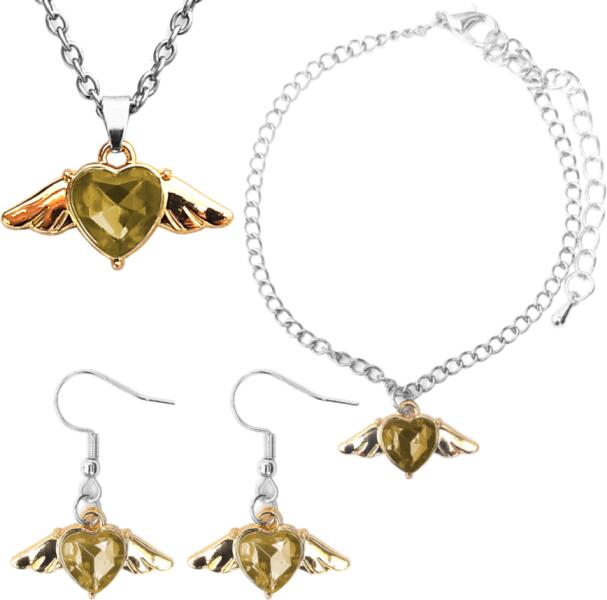 Pezsgőszínű kristály szív angyalszárnnyal nyaklánc, karkötő és fülbevaló szett. Paraméterek: Medál / mérete kb. 2,5 cm. Anyaga fémötvözet. Fémrészek anyaga rozsdamentes acél. Elegáns, nem hivalkodó, diszkrét. – Lánc hossza 50 cm. (Ha ettől eltérő méretben szeretnéd, írd be megjegyzésbe!) – Karkötő hossza kb. 17+5 cm. (Ha ettől eltérő méretben szeretnéd,