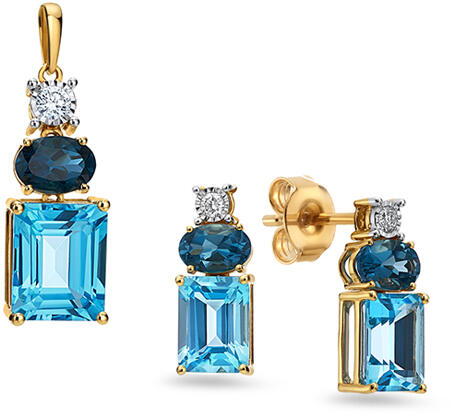 A világoskék és londoni kék topázzal díszített sárgaarany szett a modern elemeket tartalmazó elegáns ékszerek csodálatos példája. Az ékszer fő dísze a topáz két árnyalata - világoskék és londoni kék topáz, melynek tömege lenyűgöző, 10,04 ct, amelyek együtt lenyűgöző színkontrasztot alkotnak. A finom világoskék tónust és a mély londoni kéket harmonikusan egé