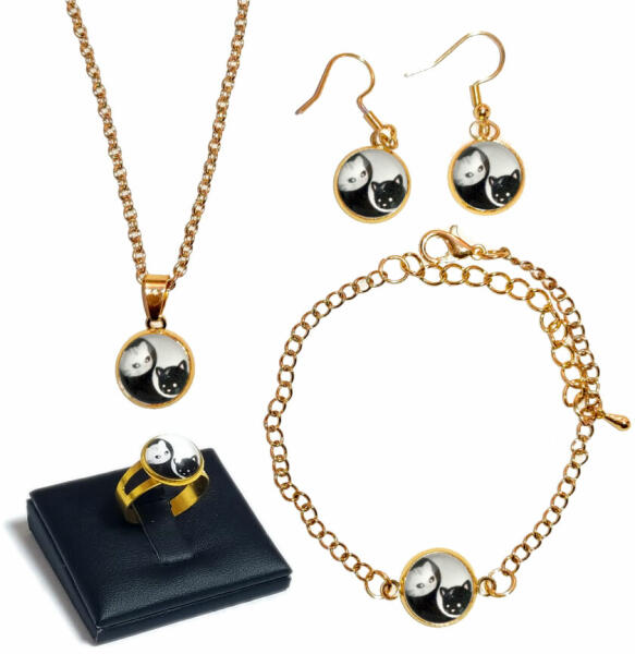 A Yin-Yang cica szett tartalma: medál lánccal, fülbevaló, karkötő, állítható gyűrű. Rendelhető arany és ezüst színekben. Válaszd ki a listából, hogy arany vagy ezüst színben, és milyen méretben kéred, vagy írd be rendeléskor a MEGJEGYZÉSBE. Az alapár 50 cm-es láncot és 17 cm-es karkötőt, állítható gyűrűt és fülbevalót tartalmaz. Egyedi, szép, kézműves üve
