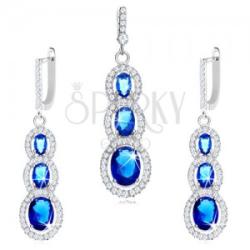 925 ezüst szett fülbevalóból és medálból függő, egymához kapcsolt ovális szemek három méretben. A szélei átlátszó apró cirkóniákkal vanak beültetve, mely közepébe ovális sötétkék cirkónia van beültetve. A láncra kerülő szem első oldala átlátszó cirkóniákkal van kirakva. A fülbevaló kapcsolása orosz patent. Medál mérete(láncra kerülő szemmel): 10 x 39 m
