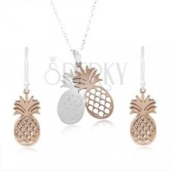 A 925 ezüst szett nyakláncból és fülbevalóból áll. A nyaklánc ovális szemekből álló láncból és medálból tevődik össze, amelyet két ananász forma alkot - az egyik réz színű vágatokkal, másik ezüst színű pontokkal díszítve. A nyaklánc hossza állítható, delfinkapoccsal záródik. A fülbevalót szintén kétszínű ananászok motívuma alkotja, amelyek afrikai horg
