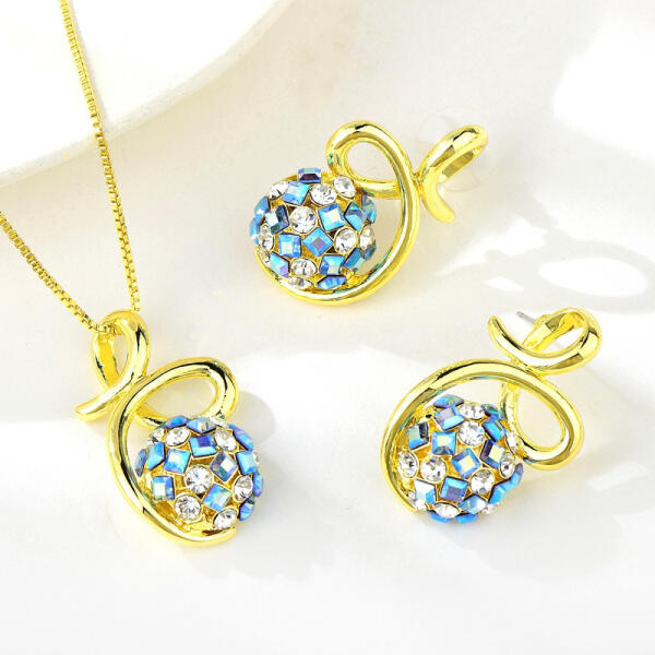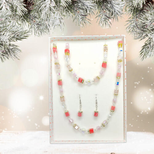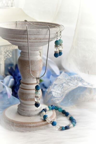 Szemet gyönyörködtető, színpompás üveg kristályos nyaklánc, karkötő és fülbevaló együttese, melyet fehér cirkónia kristályok tesznek csillogóvá. A kristályok és ásványok nemesacél sodrony alapon helyezekdnek el, fehér üveg kristály köztes szemekkel rögzítve. Tartós, minőségi anyagának köszönhetően nem kopik, nem színeződik, mindennapi viseletre is alkalmas.