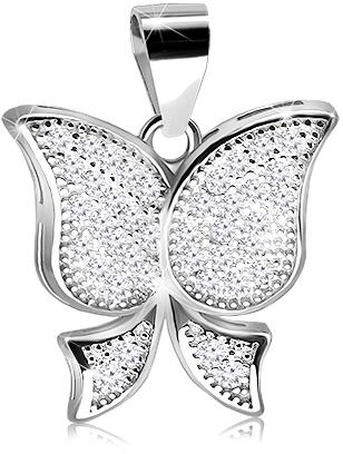 Szett 925 ezüstből ródiumozott felülettel fülbevalóból és medálból. Mindkettő pillangó alakú lekrekített szárnyakkal, amelyek közül az alsók felfelé vannak hajlítva. A pillangónak ezüst kerete van és csillogó cirkóniákkal van kirakva átlátszó színben. A fülbevaló stekkeres zárszerkezettel készült. A medál méretei : 15 x 15 mm A medál súlya: 2,26 g A láncra k