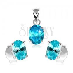 925 ezüst szett medálból, melyet világoskék cirkóniás ovális alkot csiszolt felszínnel. A kő díszesen kivágott foglalatba van belehelyezve és négy karommal megfogva. A fülbevaló is egyforma alakú, a kapcsolása pálca és stekker. A medál mérete: 6 x 8 mm A medál súlya: 0,8 g A láncra kerülő szem átmérője: 3 mm Medál lánc nélkül. A fülbevaló méretei: 4 x 6 mm A f